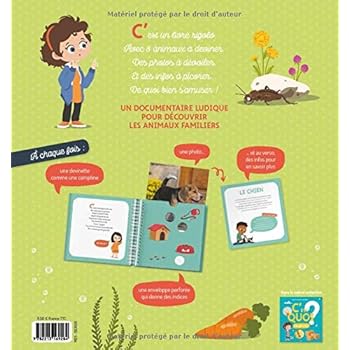 Un documentaire ludique pour découvrir les animaux familiers. Avec à chaque fois : une devinette écrite comme une comptine, une enveloppe perforée donnant des indices et, à l'intérieur de l'enveloppe, une carte avec une photo et des infos pour en savoir plus.