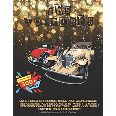 Des voitures Livre à colorier grande taille pour jeune adulte. Plus de 100 modèles de voitures: Maserati, Toyota, Mercedes, Chrysler, Peugeot, Honda et d'autres. Dessins dessinés à la main. Bon pour tous les âges. L'art-thérapie. Livres à colorier à gratter pour les enfants Grand livre 300+ pages * Grand format 216x280 mm * Fabriqué en France Allégez votre stress à chaque coup de crayon ou de stylo de couleur. Ce livre est parmi les livres de coloriage les plus populaires. Chaque cercle sacré vous aidera à vider votre esprit et à aiguiser votre créativité. C'est le meilleur livre de qualité à colorier pour les hommes, les femmes et les enfants. - PAPIER DE HAUTE QUALITÉ - Nous utilisons du papier de la plus haute qualité qui durera pendant des années. Avec des pages blanches brillantes et lisses, notre papier est idéal pour présenter les crayons de couleur, les marqueurs, les pastels et les stylos gel. - DESSINS À LA MAIN - Tous les dessins ont été minutieusement dessinés à la main puis numérisés pour nettoyer et affiner chaque ligne. Nous incluons des images bonus de chaque image dessinée à la main avant le rendu. - BON POUR TOUS LES AGES - Nos designs sont excellents pour les enfants et les adultes. Les conceptions varient en complexité du niveau débutant à expert. Permettez à votre enfant intérieur de briller. - L'ART-THÉRAPIE - Notre livre de coloriage anti-stress est une thérapie d'art pour votre âme. Un livre de coloriage peut vous aider à échapper aux appareils électroniques et vous procurer des heures de détente.